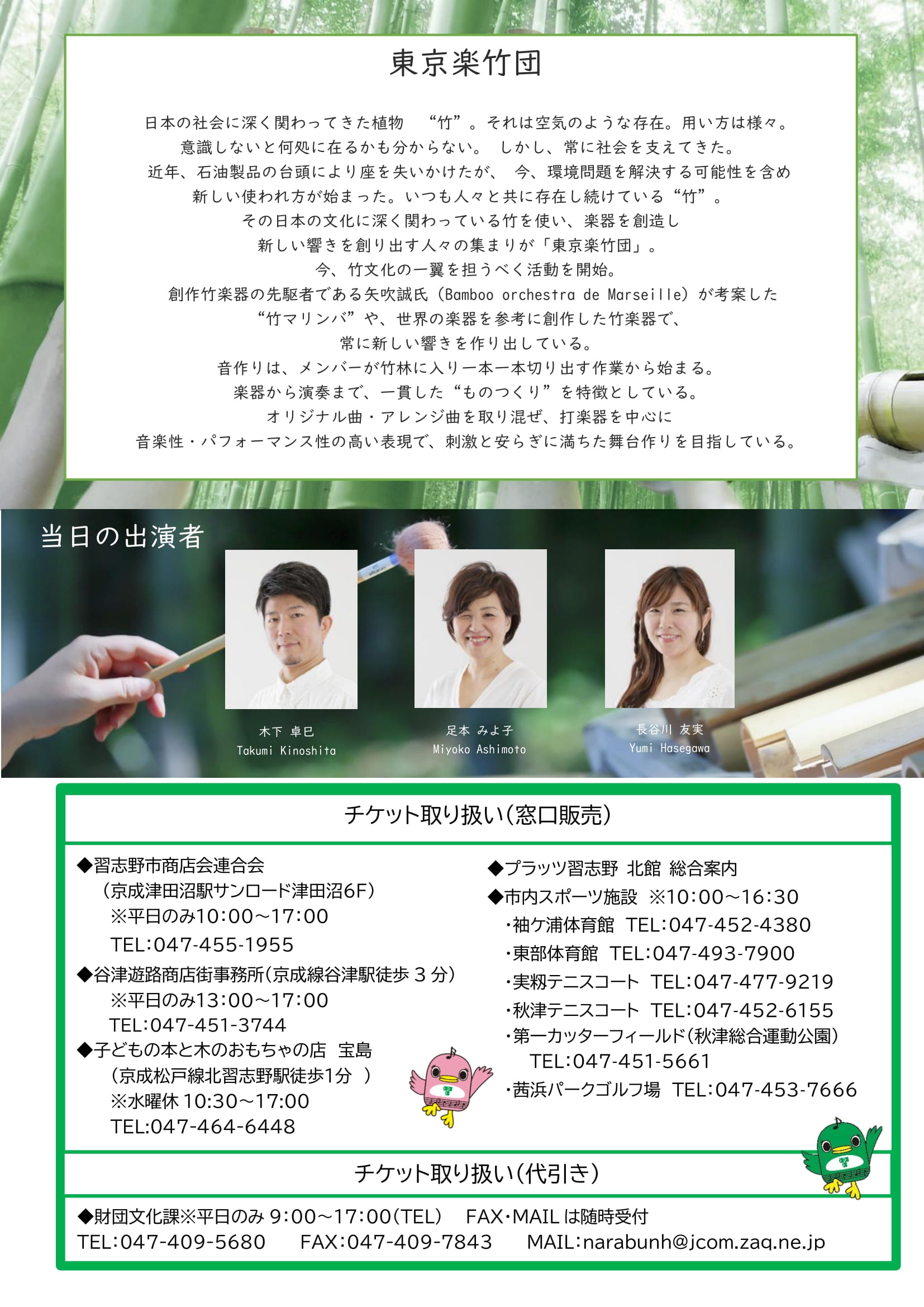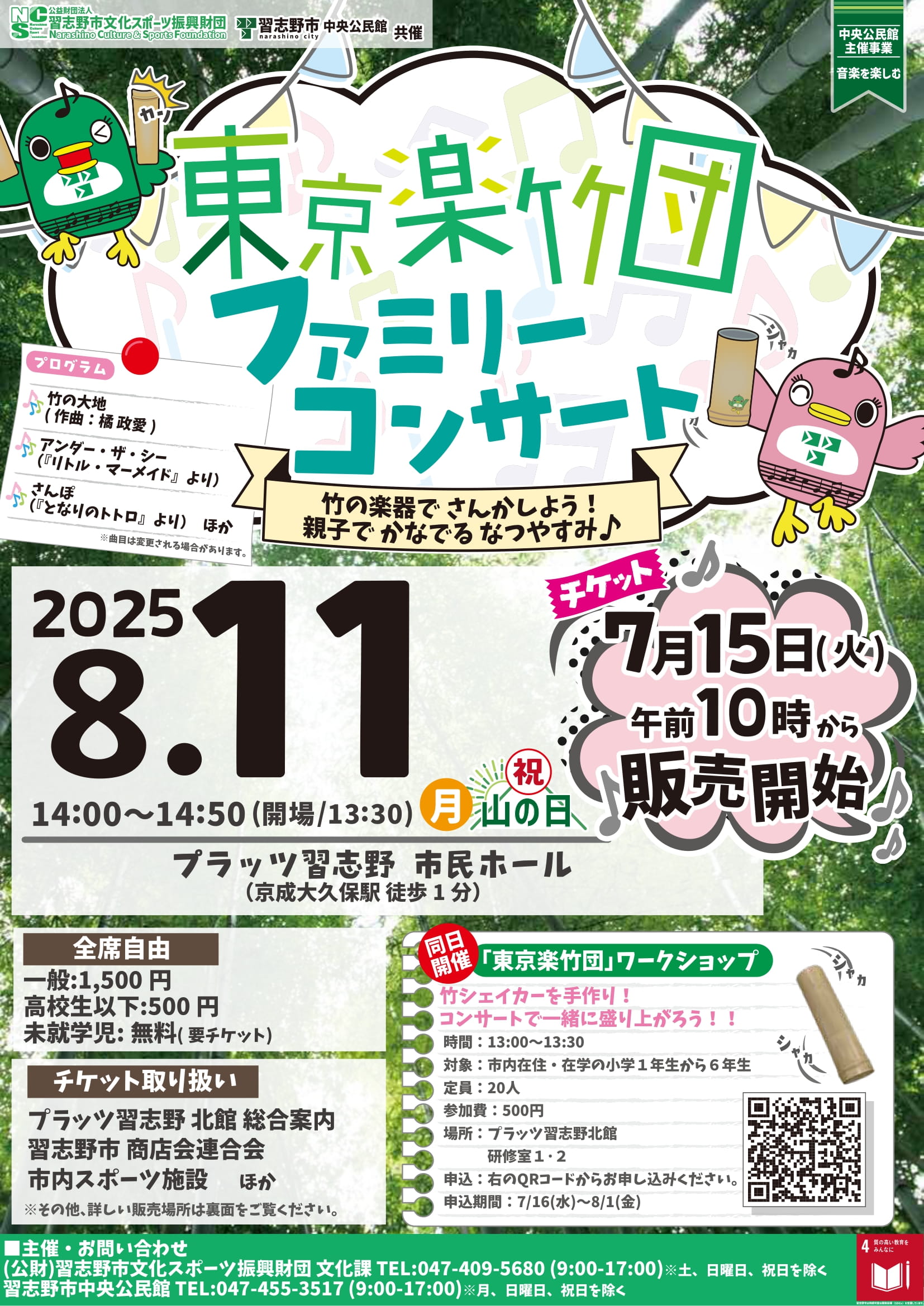 2025年8月2日 / 最終更新日 : 2025年8月2日 東京楽竹団 2025 【公演情報】8月11日(月・祝)@千葉県/プラッツ習志野 千葉県習志野市にて公演です。 東京楽竹団ファミリーコンサート 2025年8月11日(月・祝)開場13:30 開演14:00 会場:プラッツ習志野 市民ホール ▶️京成大久保駅徒歩1分 【料金】 一般:1,500円 高校生以下:500円 未就学児:無料 【申込み及び問合せ】 (公財)習志野市文化スポーツ進行財団 文化課 047-409-5680(9:00〜17:00)
